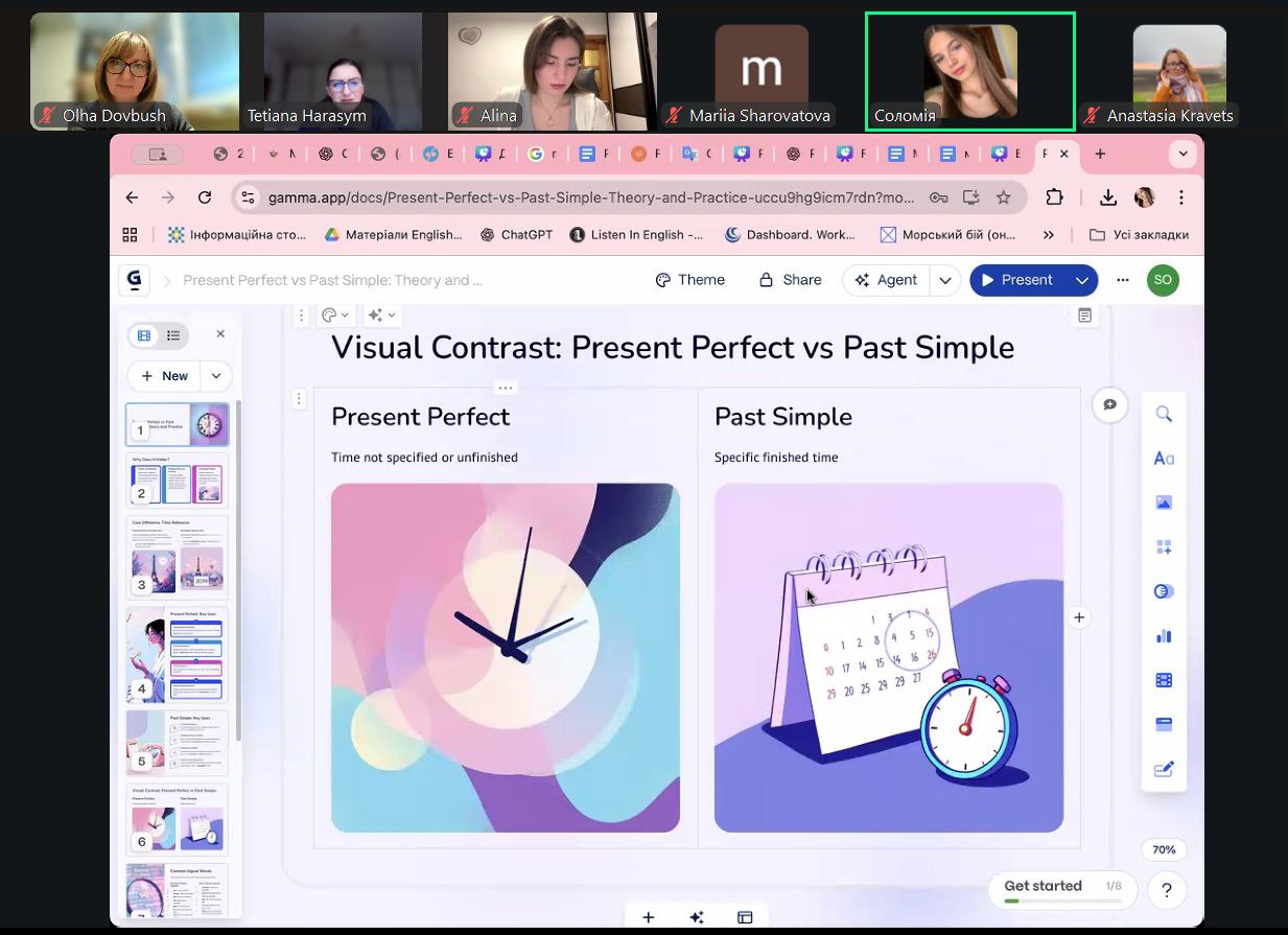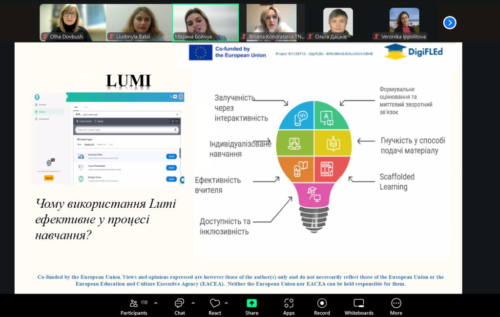 Доцентки Бабій Л.Б., Кондратьєва Т.Б., Бойчук М.І. та Шонь О.Б. поділилися цінним досвідом участі у вебінарах і розповіли про інноваційні інструменти для вивчення англійської мови, створення інтерактивних освітніх продуктів та оптимізації комунікації в освітньому просторі. Зокрема, учасники дізналися більше про гейміфікацію в навчанні англійської мови – як ігрові елементи можуть мотивувати студентів; цифрові застосунки для вивчення іноземних мов (TTSMaker, Screen Pal, Learning Apps, H5P) – інструменти, які роблять навчання ефективнішим та інтерактивним.