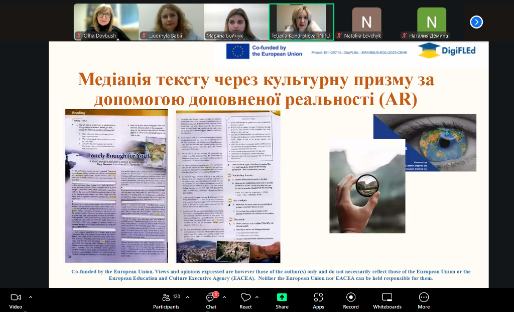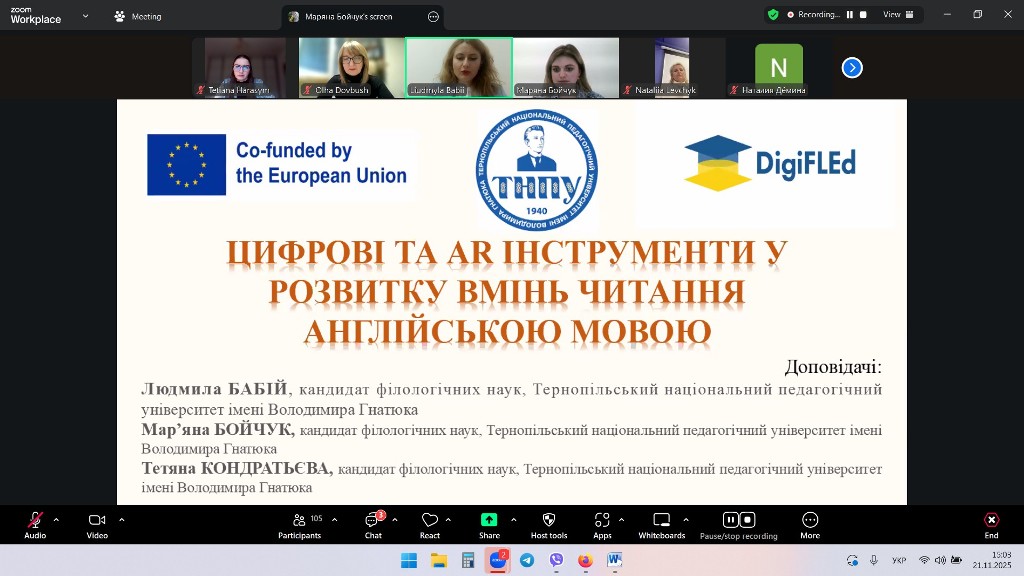 21 листопада 2025 року доцентки кафедри англійської філології та методики навчання англійської мови Людмила Бабій, Мар’яна Бойчук і Тетяна Кондратьєва провели онлайн-вебінар на тему «Цифрові та AR інструменти у розвитку вмінь читання англійською мовою». Подія зібрала широке коло учасників – викладачів, вчителів, молодих науковців і студентів педагогічних спеціальностей із різних міст України, що надало вебінару справжнього географічного розмаїття та створило багатовекторний простір професійної взаємодії.
