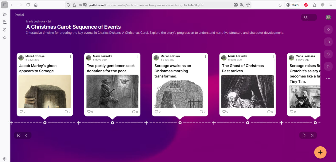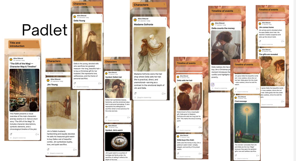 Модуль 3 був присвячений цифровим застосункам у роботі з художніми творами: студенти вивчали функціонал застосунків, які дозволяють спільно працювати в процесі аналізу творів (Padlet, Wakelet, ScreenPal), створювали інтерактивні навчальні матеріали й тести за допомогою генеративних AI-технологій (Magic School, Genially), моделювали сюжети та візуальні формати оповіді, а також досліджували можливості VR і AR для літературних студій, використовуючи ARTutor. Проєктні роботи продемонстрували здатність студентів створювати повноцінні мультимодальні освітні продукти.