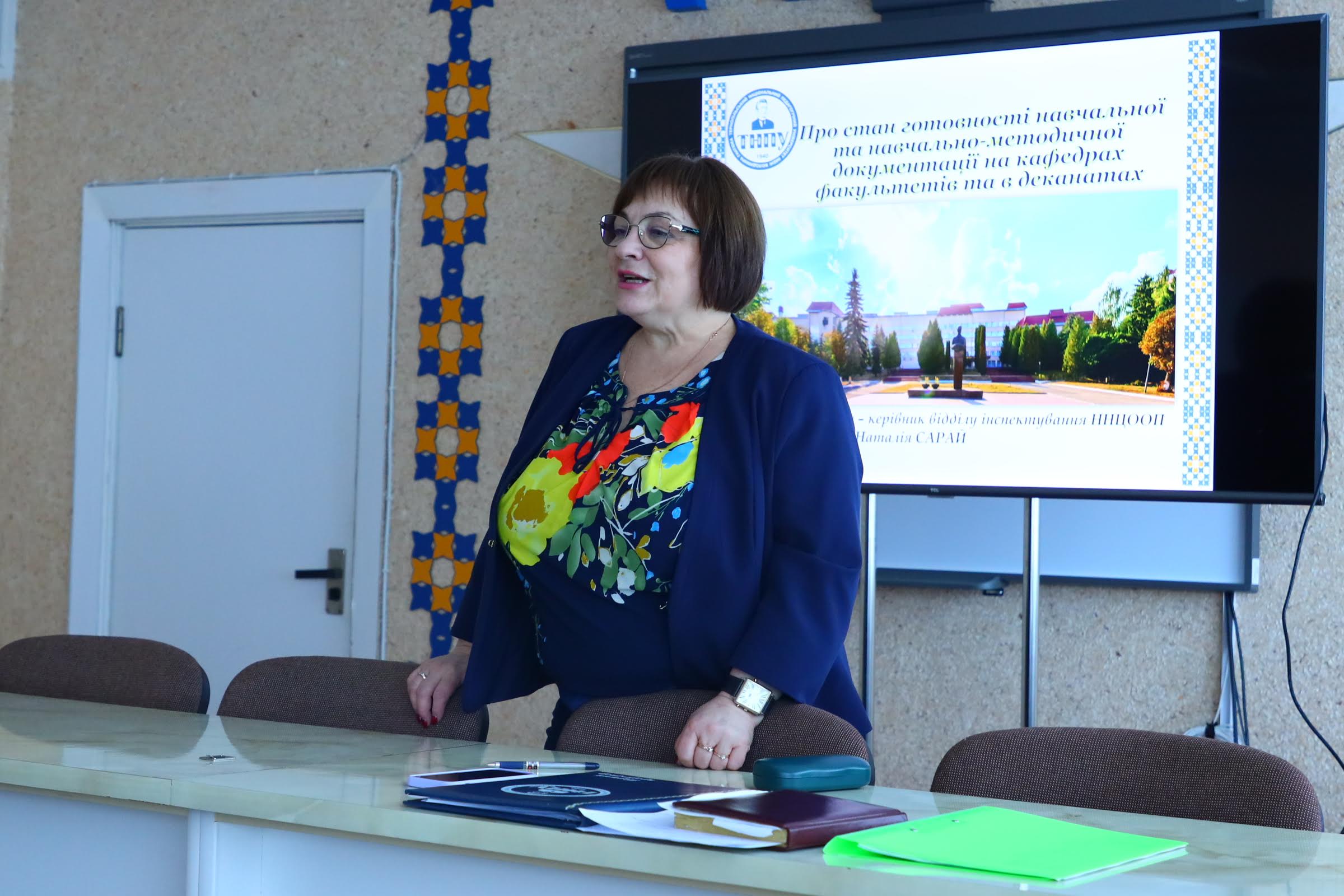 Керівник відділу інспектування Наталія Сарай у своїй доповіді відзначила позитивні зміни щодо ведення необхідної документації у деканатах та на кафедрах. У змістовно наповнених планах роботи деканатів та кафедр представлено пріоритетні напрямки діяльності на рік. На всіх кафедрах оновлено і затверджено робочі програми навчальних дисциплін. Навчальні та робочі навчальні плани затверджені та внесені в електронну систему ОБЛІК. На інформаційному порталі представлено всю необхідну та актуальну інформацію, що стосується організації освітнього процесу. Оновлено навчально-методичні комплекси дисциплін у системі Moodle, викладання яких забезпечується кафедрами.
