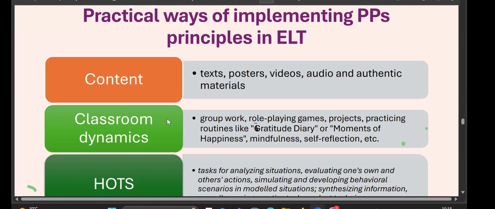 Тема лекції є на часі особливо в умовах, у яких доводиться працювати українським освітянам. Спікери ознайомили аудиторію із теоретичними принципами позитивної психології та продемонстрували, як їх можна застосовувати під час вивчення англійської мови. Слухачі мали нагоду взяти участь у інтерактивах та випробувати теорію в дії.