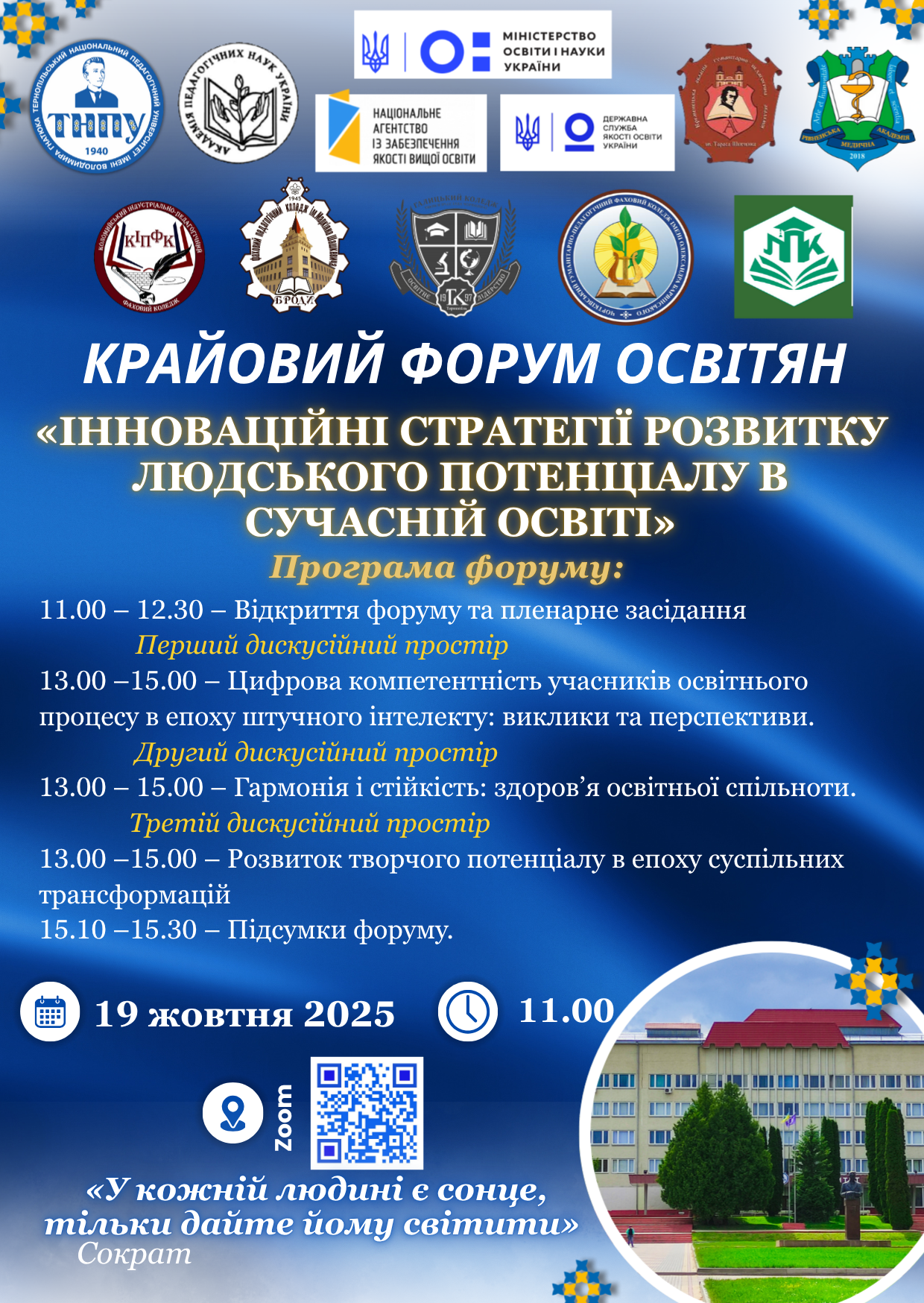 Запрошуємо до участі у VII Крайового форуму освітян «Освіта – енергія майбутнього», який відбудеться 19 жовтня 2025 р. на тему: «Інноваційні стратегії розвитку людського потенціалу в сучасній освіті».