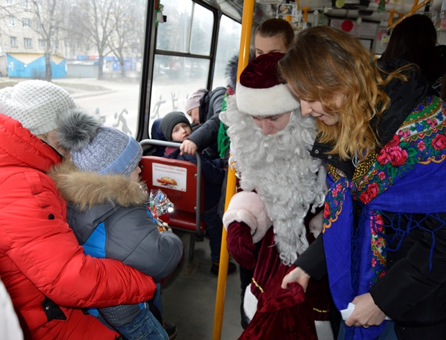 У салоні тролейбуса відбулося дійство з участю Святого Миколая та його помічниць. Усі дітки отримали від подорожі позитивні емоції, а від щедрого Миколая — подаруночки.