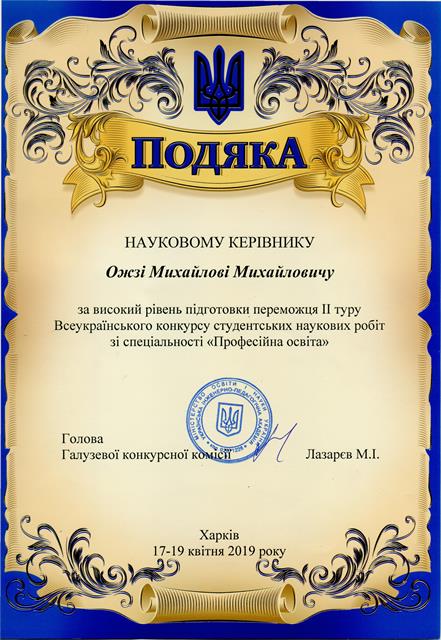 З 17 по 19 квітня 2019 р. в Українській інженерно-педагогічній академії (м.Харків) відбувся ІІ тур Всеукраїнського конкурсу студентських наукових робіт зі спеціальності «Професійна освіта».