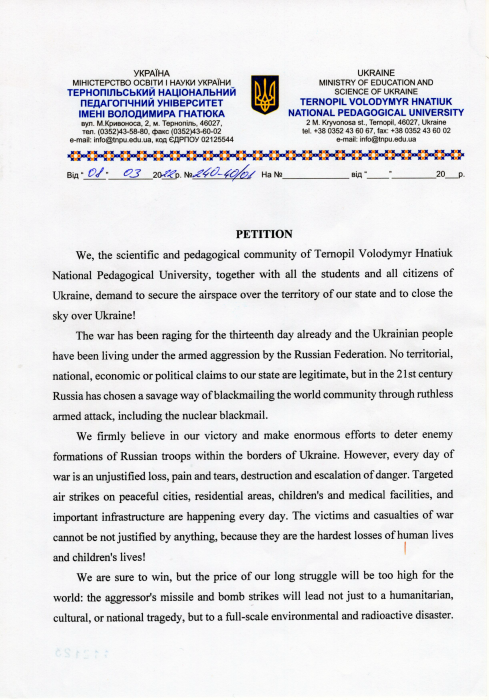 Текст петиції, надісланої нашим партнерським вишам за кордоном